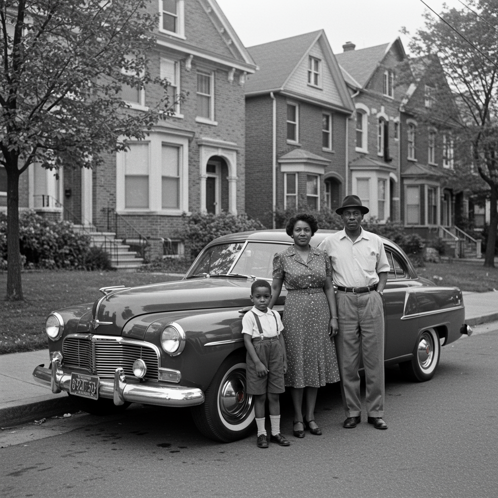 Jackie Robinson, his wife Rachel, and their son Jackie Jr. posing by their car in Brooklyn, New York in July 1949.